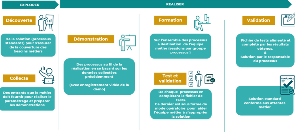 Notre démarche projet est basée sur la méthodologie SAP Activate de l’éditeur SAP que nous avons adaptée afin d’embarquer l’équipe métier dès le début du projet tout en limitant leur sollicitationpour leur permettre de rester focus sur leur business.